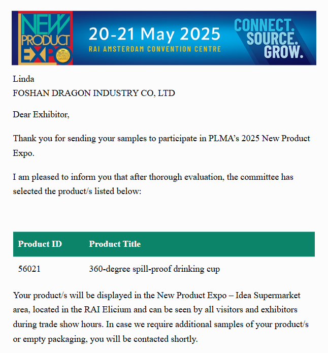 We are thrilled to announce that Dragon has been selected for the New Product Expo at PLMA 2025 World of Private Label International Trade Show with our innovative product – the 360-degree spill-proof drinking cup. The event will take place at the RAI Amsterdam Convention Centre from May 20-21, 2025, attracting top retailers, brands, and buyers from around the world.